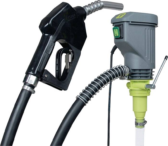 zur Förderung von Diesel, Heizöl und Kühlerfrostschutzmittel (unverdünnt) · 230 V 50 Hz, 250 W · Ansaugstufe mit integriertem Hebeschutz · Fassgewinde M 64 x 4 und G 50,80 mm (2") · inkl. Saugschlauch mit Filter für Tauchtiefe bis 1600 mm und Zapfschlauch 4 m, DN 19 x 4 · mit Knickschutzfeder, Standard-Zapfventil oder bauartzugelassenem Automatik-Zapfventil mit Schlauchdrehgelenk · Schutzart IP 44Weitere technische Eigenschaften:· Schlauchlänge: 4m· Gewinde: M 64 x 4 und G 50,80 (2")mm· Spannung: 230 V 50Hz