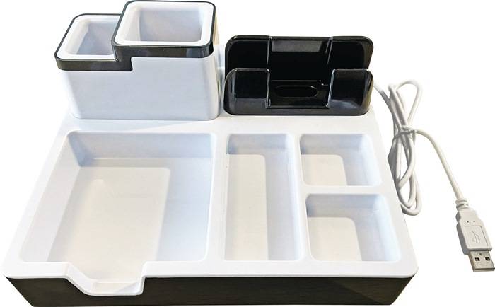mit 3 USB-Anschlüssen ∙ Platz für Büroklammern, Stifte, Post-It-Blöcke usw. ∙ kompatibel mit fast allen Smartphones und Tablets ∙ Farbe schwarz/weiß