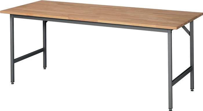 Untergestell aus Profilstahlrohr 30 x 30 mm mit integrierter Höhenverstellung · Querstreben oben (vorne und hinten) · Tragfähigkeit max. 300 kg bei gleichmäßig verteilter statischer Flächenlast · Platte Buche-Massiv oberflächenbehandelt, Kanten abgerundet · Stärke 25 mm · umweltfreundliche Pulverbeschichtung in anthrazitgrau, RAL 7016 · zerlegte Anlieferung, einfache Montage