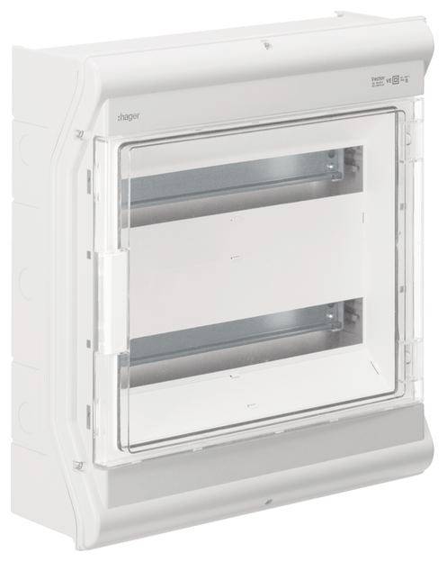Kleinverteiler, vector, APV, IP65, 36PLE, UV-stabil, ohne Leitungseinführung. Installationskleinverteiler aus Polycarbonat (UV-beständig), nach DIN EN 60670-24, nach DIN 43871. Zum Einbau von Geräten bis 63 A nach Maßnorm DIN 43 880 mit 70 mm oder 85 mm Einbautiefe, Bemessungsspannung AC 400 V/50 Hz. Bestehend aus Kunststoffunterteil mit Hutprofilschiene aus verzinktem Stahlblech, Vorprägung für metrische Leitungseinführungstüllen (oben, unten), seitliche Vorprägungen für Verbindungstüllen zur Verbindung von zwei oder mehreren Verteilern nebeneinander. Oberteil mit 46 mm Geräteschlitz. Klarsichttür frontbündig, rechts oder links anschlagbar, plombierbar, abschließbar, Verteiler anflanschbar.