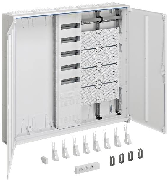 Systemschrank, Multimedia, universZ, SKII, IP44, VF-5rh/APZ, 5-feld. Zählerschranklösung Schrankgehäuse nach DIN VDE 0603/1, Maßnorm DIN 43 870 zur Aufputz, Unterputz oder teilversenkter Montage. Bestehend aus Schrank mit Tür aus pulverbeschichtetem, eingebranntem, stabil profiliertem 1 mm dickem Stahlblech. Innenauskleidung komplett aus Kunststoff. Leitungseinführungen oben und unten durch eingebaute Kunststoffflanschplatten. Rückseitige Vorprägung im Kunststoffteil. Sammelschienendurchführungen als beidseitige seitliche werkzeuglos zu öffnende Flansch im unteren Bereich als Möglichkeit zur Sammelschienenverbindung von verschiedenen Schränken oder in Verbindung mit einem Kabelanschlusskasten und Anschlusssatz. Neben der Durchführung im NAR zusätzlich Öffnungen im Bereich des AAR (für Bauhöhe 1100 und 1400 mm) und RfZ (für Bauhöhe 1100mm). Tür frontbündig mit innenliegenden, justierbaren Scharnieren, wahlweise rechts oder links anschlagbar mit 110° Öffnungswinkel. Türverschluss mit Vorreiber. Türverschluss durch andere Schließungen austauschbar. Schrank nebeneinander und übereinander anflanschbar. Schrankgröße 1- bis 5-feldrig mit 72 bis 540 Platzeinheiten (PLE). Hinweis: Die Hauptleitung ist nach VDE-AR-N 4100:2019-04 von unten oder seitlich in den unteren Anschlussraum des Zählerschrankes einzuführen und dort anzuschließen. Höhe: __ mm (1100mm oder 1400mm) Breite: __ mm Tiefe: 205 / 160 mm, RAL-Farbe: 9010 Schutzart 44, Schutzklasse II Nennstrom des Sammelschienensystems 250 A Ausführung nach VDE-AR-N 4100:2019-04 Zähleranlage für __ Zählerplatz(e). Nach den technischen Anschlussbedingungen (TAB) des VNB __ für: __ Elektronische Haushalts-Zähler (eHZ) oder __ Zähler mit 3-Punktbefestigung (3HZ). __ für Bezugsanlagen mit haushaltsüblichem Verbrauch max. 63 A (10mm²) nach DIN 18015-1 ( __ Wohnungen, __ Allgemein, __ Reserve, __ Wärmepumpe) __ für Dauerstromanwendungen max. 32 A (10 mm²) nach VDE-AR-N 4100:2019-04 (z.B. PV bis 22 KW) __ für Dauerstromanwendungen m