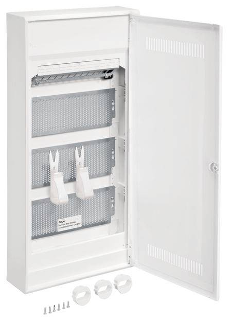 Multimedia, volta, APV, 4-reihig, mit geschlitzter Kunststofftür. Installationskleinverteiler Aufputz aus Kunststoff, nach DIN VDE 61439-3, geeignet zum Einsatz in Wohngebäuden nach DIN 18015 und zum Einbau von schutzisolierten VDI Komponenten. Schutzart IP30, Schutzklasse II schutzisoliert. Bestehend aus Kunststoffbodenplatte mit serienmäßigem Leitungsabfang, Lüftungstür aus Stahlblech mit geschlitztem Kunststoffeinsatz für ein besseres WLAN-Signal, pulverbeschichtet und eingebrannt und frontbündig mit innenliegenden handbedienbaren Scharnieren. Türverschluss mit frontbündiger Griffmulde und selbsttätig zurückklappendem Griff, Türanschlag rechts oder links. Oberer Anschlussraum: Patch Panel und DIN-Hutschiene isoliert aufgerastet zur Aufnahme von unterschiedlichen Kommunikationsmodulen, für den geforderten Funktionspotentialausgleich nach DIN EN 50310 (VDE 0800-2-310) sind am Patch Panel 2 Schraubbefestigungen vorhanden. Beschriftungsmöglichkeit mit beiliegendem Bezeichnungsstreifen zur Portbeschriftung. Vormontierte gelochte Montageplatten aus verzinktem Stahlblech mit 3,2 mm Lochung sind eingebaut. Ein Universalhaltebügel kann für die schraublose Befestigung von VDI-Komponenten direkt auf dem Lochblech eingehängt werden. Im unteren Anschlussraum ist eine 3-fach Schutzkontaktsteckdose (90° drehbar) montiert. Über eine Anschlussklemme sind die Steckdosen direkt anschließbar. Die Steckdosen sind mit einer beiliegenden Schutzkontaktabdeckung zur Einhaltung der Schutzklasse II bestückbar. Hinweis: Ein Überspannungsschutzmodul Typ 3 kann direkt angeschlossen werden (nicht enthalten).