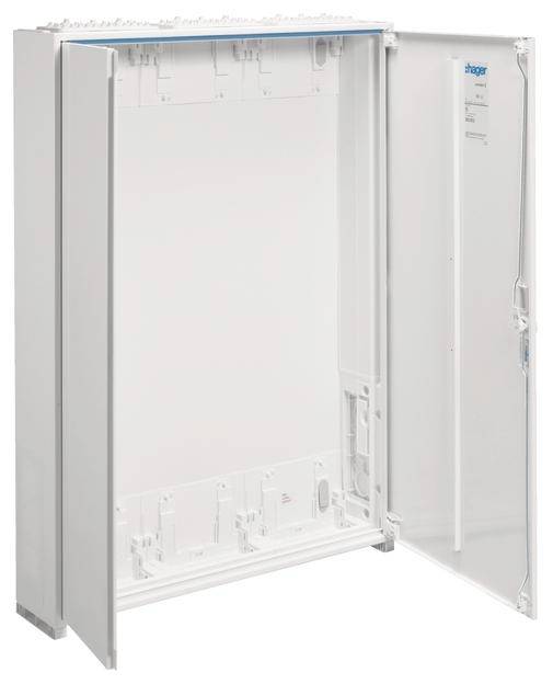 Leerschrank, universZ, 1100x800x160mm, Schutzklasse II, IP44, 252 Platzeinheiten. Wandaufbauschrank bzw. Wandeinbauschrank mit VDE-Zeichen (Fertigungsüberwachung) nach DIN VDE 0603-1, Maßnorm nach DIN 43 870, zur Aufputz- oder Unterputzmontage oder teilversenkter Montage, zum Aufbau einer Zählerplatzanlage bis 355 A, AC 230/400 V 50 Hz, Schutzart IP44, IP54, DIN VDE 0470-1, Schutzklasse II, Schutzart IP3X hinter der Tür, Luft- und Kriechstrecken nach DIN EN 60664-1. Bestehend aus Schrank mit Tür, ab 800 mm Breite mit zwei Türen, Korpus und Türen aus pulverbeschichtetem, eingebranntem, stabil profiliertem 1 mm dicken Stahlblech. Innenauskleidung aus Isolierstoff, oben und unten werkzeuglos abnehmbare 2-Komponenten Leitungseinführungen. Rückseite mit Vorprägungen im Kunststoffteil zum Einbau von 2-Komponenten, Leitungseinführungen, seitlich integrierte abnehmbare Sammelschienendurchführungen mit Vorprägungen für Leitungseinführungen. Tür frontbündig mit innen liegenden, justierbaren Scharnieren, wahlweise rechts oder links anschlagbar, Öffnungswinkel =110°. Türverschluss mit Vorreiber und Stangenverschluss als Dreipunktschließung, Türverschluss austauschbar, ersetzbar durch andere Schließungen. Schränke können nebeneinander und übereinander montiert werden, Schränke können nebeneinander und übereinander mechanisch als auch elektrisch verbunden werden.