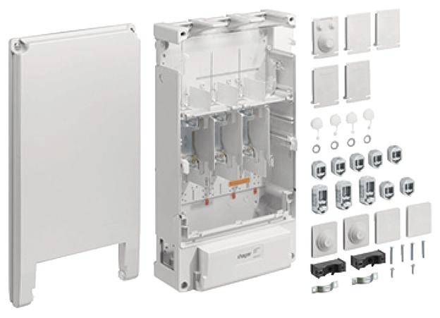 Hausanschlusskasten, KH1, Baureihe K12, 1x3NH2, Durchschleif-Ausführung. Hausanschlusskasten nach DIN 43627 und DIN VDE 0660-505, Schutzart IP 54, Gehäuse aus glasfaserverstärktes Polyester. Plombierbares Gehäuse mit Kabel-Einführungen, Gehäusedeckel in 15 Grad-Stellung aushängbar. Als Einbauten dient ein NH-Sicherungsunterteil mit Berührungsschutzabdeckung.