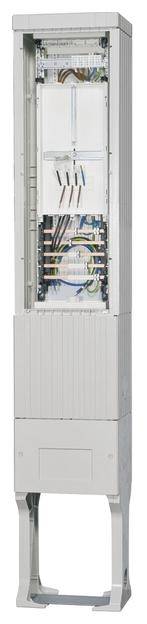 Zähleranschlusssäule 202, universZ, 1 Zählerplatz, 3-Punkt, 5-polig, VNB. Zähleranschlusssäule, Schutzart IP 44, als Basissäule inklusiv Eingrabsockel, aus glasfaserverstärktes Polyester FS 833.5 nach DIN EN 14598. Durch Zusatzbauteile wird die Basissäule zu einer anschlussfertigen Zähleranschlusssäule des entsprechenden VNB ausgebaut. Profiliertes Gehäuse im Rippendesign. Tür mit Öffnungswinkel 180 Grad bei freiem Stand und 90 Grad bei angereihten Gehäusen. Rechte Tür ist aushängbar. Schließung mit Schwenkhebel und Drei-Punkt-Basküleverschluss mit 1 bzw. 2 Profilhalbzylindern. Eingebauter Zylinder unten mit gleichschließender Serie. Ein zweiter Schließzylinder (z.B. aus VNB-Schließanlage) kann oben nach Entfernen des Vierkantverschlusses eingebaut werden. Wenn kein zweiter Profilhalbzylinder eingebaut wird, muss die zweite obere Öffnung mit einem Blindverschluss bestückt werden. Die Belüftung erfolgt über labyrinthartig ausgebildete Lüftungskanäle, verhindert das Eindringen von Fremdkörpern und ist stochersicher. Zähleranschlusssäulen sind gebaut nach technischer Richtlinie: Anschlussschränke im Freien/Anschluss von ortsfesten Schalt- und Steuerschränken und Zähleranschlusssäulen an das Niederspannungsnetz des VNB. Der Einbau besteht aus schutzisolierten Zählerfeldern DIN 43870 (Funktionsflächen) für Zähler. Zählerplätze sind vorgerichtet für eine IP54 Abdeckung. Eingrabsockel und Zähleranschlusssäule bilden eine Einheit. Ein Bodenrost ist empfohlen. Zur Betauungsvermeidung ist der Sockel bis zur Höhe der Kabelbefestigungsschiene innen mit Sockelfüller aufzufüllen.