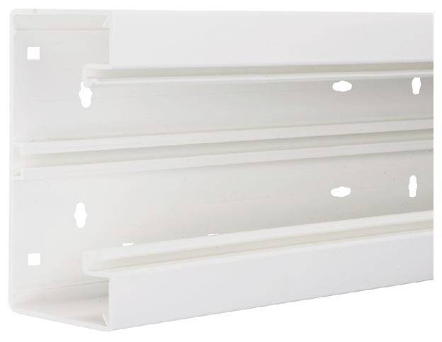 Brüstungskanal-Unterteil PVC frontrastend zu BR 68x130mm OT 80mm in verkehrsweiß. Kanalunterteil zum Elektro-Installationskanal-System Brüstungskanal aus Kunststoff nach DIN EN 50085-1 als Geräteeinbaukanal mit Oberteilbreite 80 oder 120 mm zum Einbau handelsüblicher Geräte ohne oder mit Zusatzblenden. Mit Bodenlochung (allseitiger Bohrtolleranzausgleich) zur direkten Wandmontage und zusätzlicher Rechtecklochung zur werkzeuglosen Befestigung des Kanals mittels Clip-Technik auf Konsolen. Mit frontrastendem, werkzeuglosem Geräteeinbau zur Befestigung von Geräten und Geräteeinbaudosen mit Schnellbefestigung. Zusätzliches C-Profil als Geräteeinbaumöglichkeit. Kupplungen zur einfachen und passgenauen Kanalmontage, Trennwände und Leitungsrückhalteklammern als Zubehör erhältlich. Hinweis: Schall- und Brandschutz-Maßnahmen sind fachgerecht auszuführen.