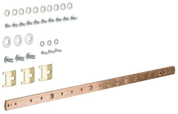 Erdungsschiene, univers, Cu 20 x 5 mm, 2-feldig. Schutzleiterverbindung als Cu-Schiene 20 x 5 mm mit Schrauben zur PE-Befestigung zwischen den Tragschienen zum Schrankeinbau .