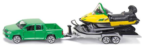 Dieses Set bietet höchsten Spielspaß abseits befestigter Pisten in tief verschneiten Gebieten. Der VW Amarok zieht den Anhänger mit dem Snowmobil kräftig die Serpentinen hoch, bis der Weg nur noch mit dem Snowmobil selbst zu meistern ist. Türen auf, das Snowmobil vorbildgerecht vom kippbaren Anhänger laden und geschmeidig durch die Landschaft cruisen. Die in die Kettennachbildung eingepassten Räder erleichtern das softe Gleiten auf jedem Untergrund.
