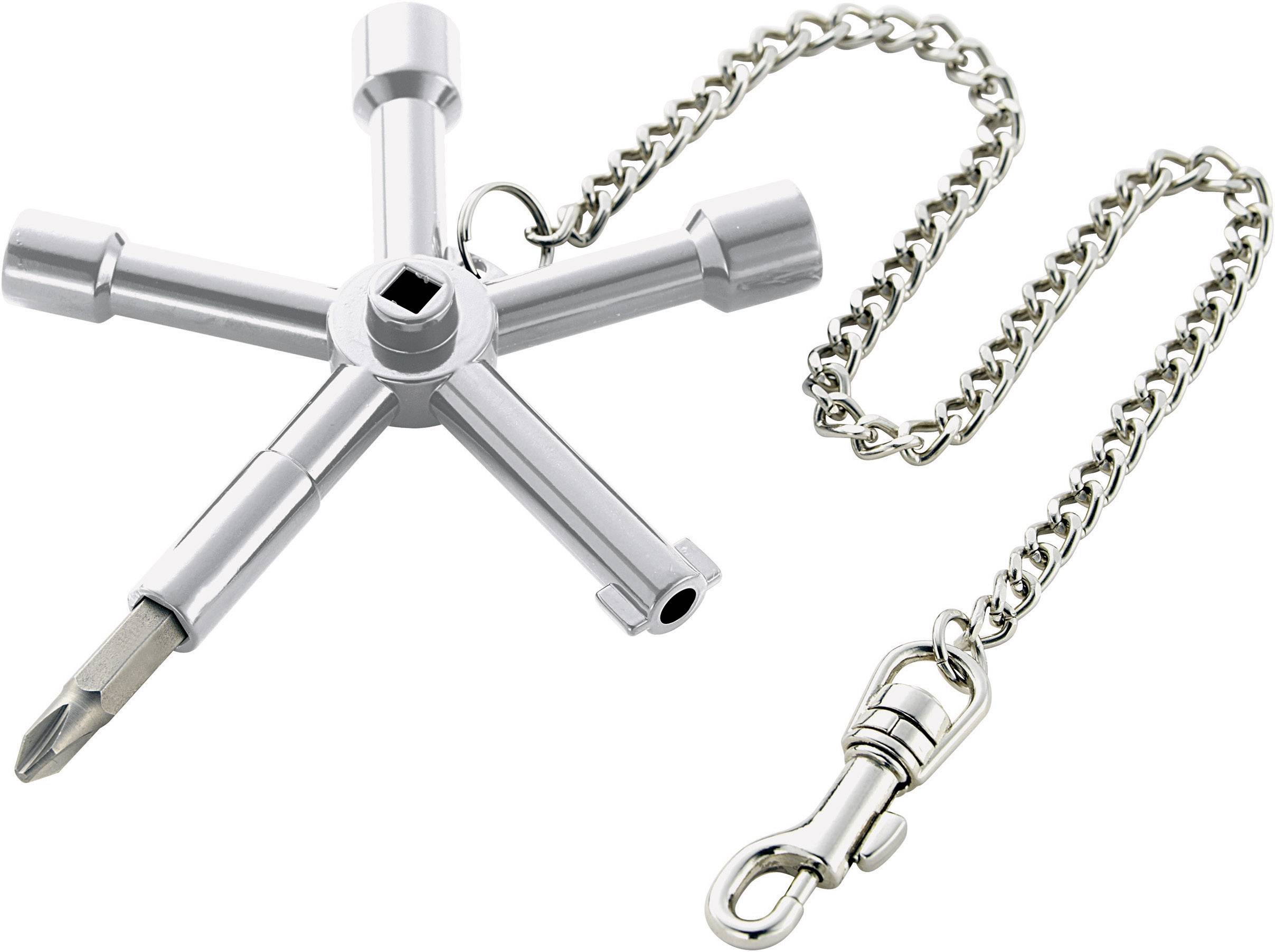 Kreuzsteckschlüssel aus Zinkdruckguss mit Kette und Karabinerhaken · Magnetbithalter · Schlüsselgrößen: Außen-Vierkant: 6/8 mm, Außen-Dreikant: 9 mm, Doppel-Bart: innen Ø 5/außen 9 mm, Vierkant 5 mm, Wendebit Schlitz: 1,0 x 7,0 mm/Kreuzschlitz: PH 2.