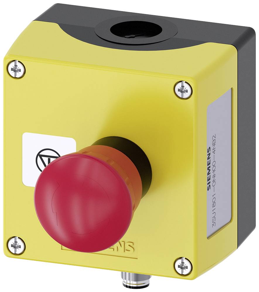 Gehäuse für Befehlsgeräte, 22 mm, rund, Gehäusematerial Kunststoff, Gehäuseoberteil gelb, 1 Befehlsstelle Kunststoff, A=NOT-HALT-Pilzdrucktaster rot, 40 mm, drehentriegelt, 2Ö, Federzuganschluss, Bodenbefestigung, Schild silber, Schrift schwarz, mit grafischem Symbol: NOT-HALT, M12-Stecker (5-polig) unten, isolierte Reserveadern, Steckerbelegung: PIN1=21, PIN2=11, PIN3=n.c., PIN4=22, PIN5=12 Schild beigelegt Gehäuse SIRIUS ACT für die Montage der 22,5 mm Befehls- und Meldegeräte bei räumlich getrennter Anordnung von Steuereinheiten und Schaltschränken.
