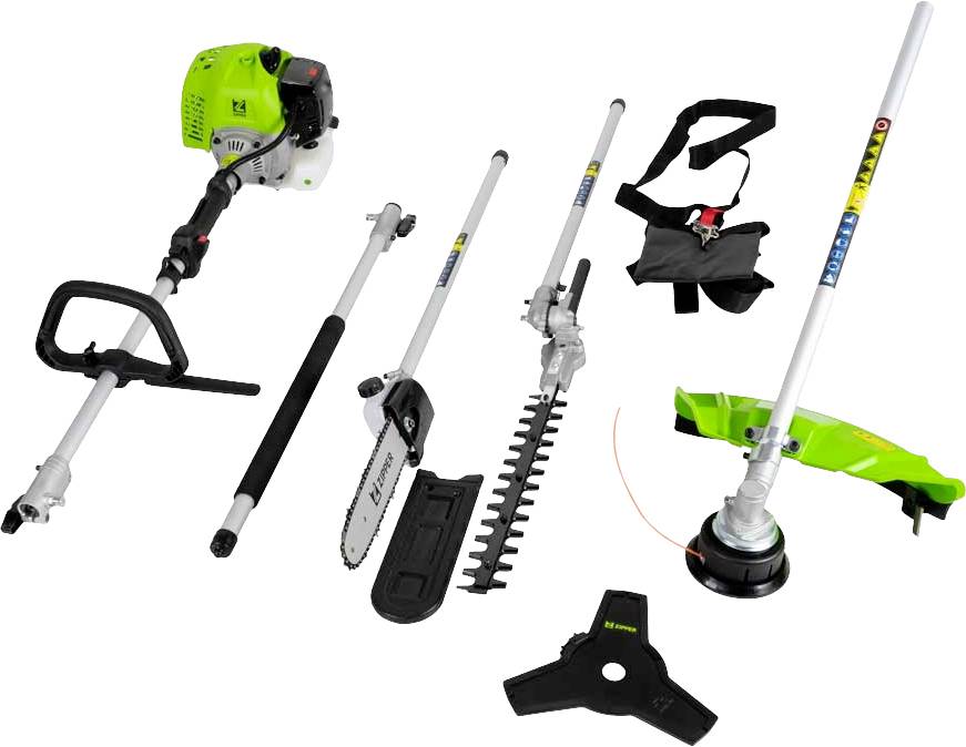 Das Gartenpflege-Set von Zipper besteht aus einem Rasentrimmer, einer Astsäge, einer Heckenschere inkl. Zubehör. Luftgekühlter 1-Zylinder-2-Takt-Motor mit Fliehkraftkupplung. Individuell verstellbarer Haltegriff und Gurt.