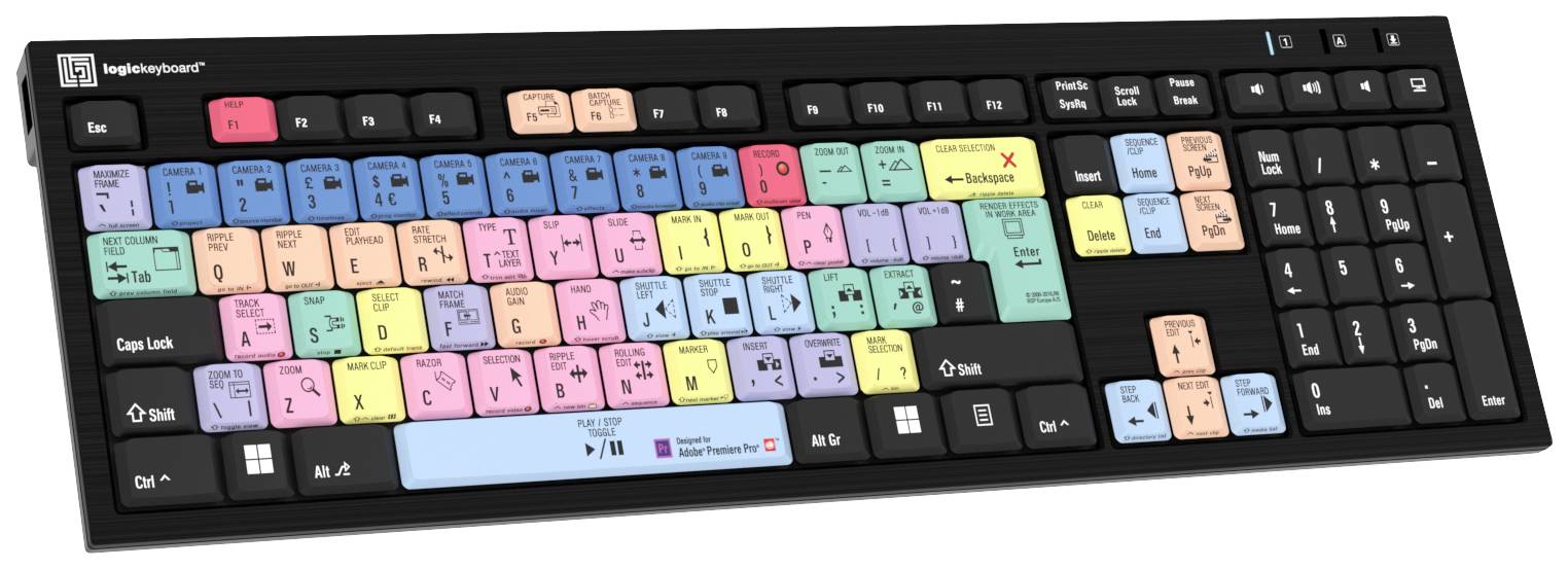 Das dedizierte LogicKeyboard macht die Steuerung von Adobe Premiere Pro CC viel einfacher und schneller. Es ist ideal für Postproduktionsbetriebe, professionelle Videobearbeitungsbetriebe und alle anderen, die alle benutzerdefinierten Tastenbefehle über eine dedizierte, klar beschriftete und farbcodierte Tastatur leicht zugänglich benötigen. Die Verwendung dieser Tastatur eignet sich auch hervorragend zum Erlernen der Tastenbefehle von Adobe Premiere Pro CC. Und da die dedizierte Tastatur von Adobe Premiere Pro CC auch über alle regulären Buchstaben-, Zahlen- und Symbolbeschriftungen verfügt, die Sie auf einer herkömmlichen Tastatur finden, kann sie einfach als Ersatz dafür verwendet werden.