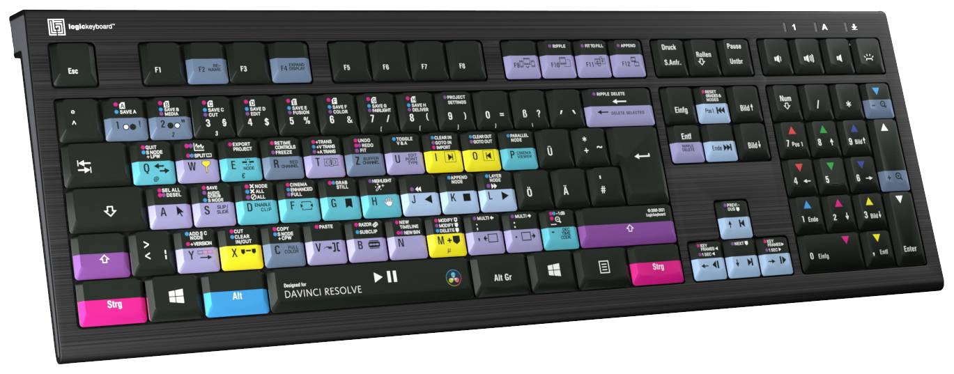 Die dedizierte Logic-Tastatur von Blackmagic DaVinci Resolve verfügt außerdem über alle regulären Buchstaben, Zahlen und Symbolbeschriftungen, die Sie auf einer herkömmlichen Tastatur finden, sie kann einfach als Ersatz dafür verwendet werden. Die Tastatur lässt sich einfach anschließen und erfordert keine Softwareinstallation.