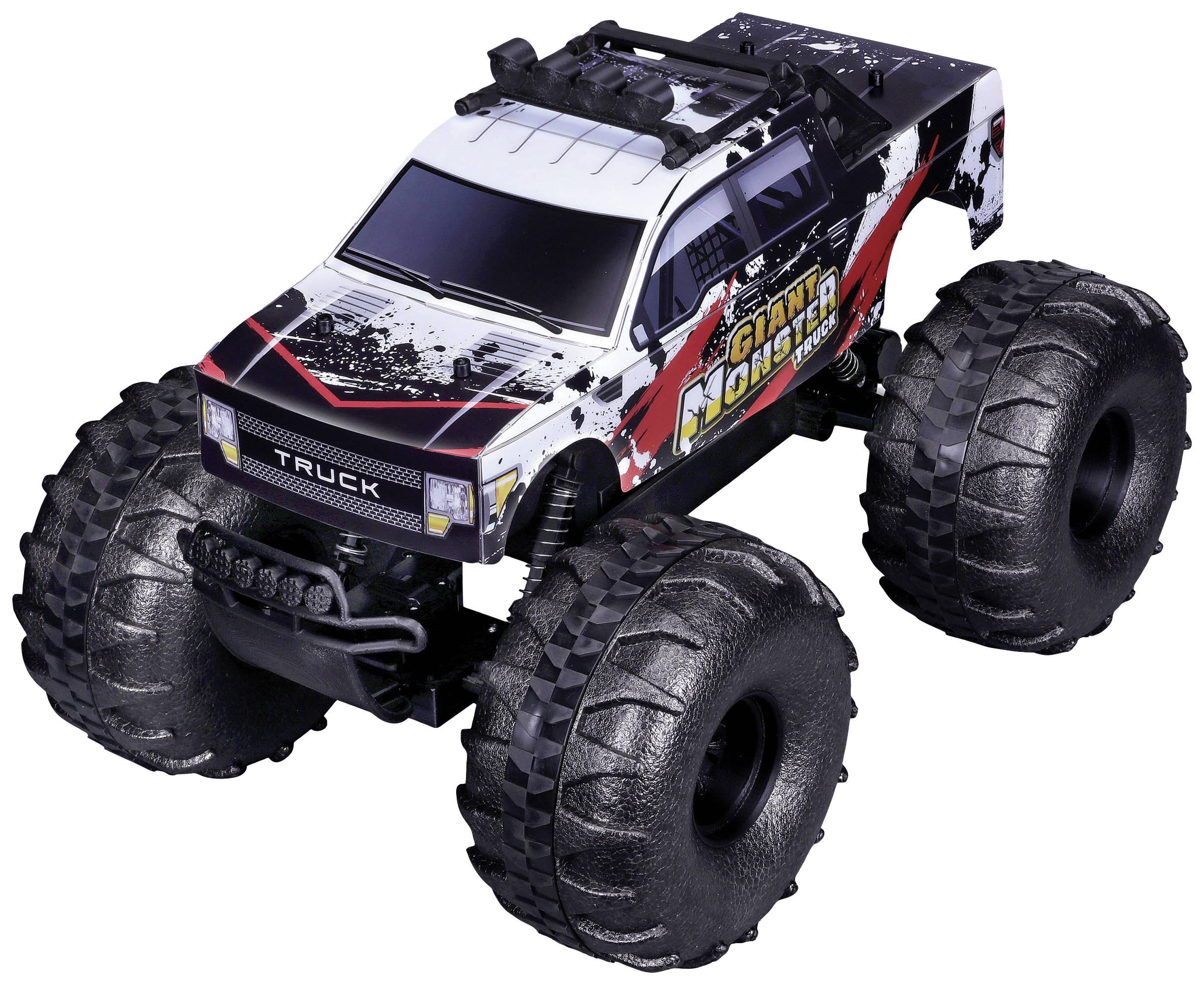 Groß, größer, Giant Wheel Offroad! Der ferngesteuerte Giant Wheel Offroad von Maisto Tech R/C ist ein gigantisches Gefährt für maximale Offroad Action. Der platzsparend verpackte Monstertruck besteht zwar aus 37 Einzelteilen, aber er lässt sich innerhalb weniger Minute kinderleicht zusammenbauen. Das fertige Fahrzeug verfügt über Allradantrieb, eine leicht zu bedienende Mini Pro-Fernbedienung, eine 2,4 GHz Frequenz, eine Reichweite von ca. 35 m und einen wiederaufladbaren USB-Akku. Dank seiner Geschwindigkeit von ca. 16 km/h lässt sich das 60 cm große Fahrzeug problemlos von Fahrern ab 8 Jahren steuern. Im Lieferumfang sind Batterien und ein USB-Kabel enthalten. (1x Lithium-Akku für das Fahrzeug und 2x AAA für die Fernbedienung)