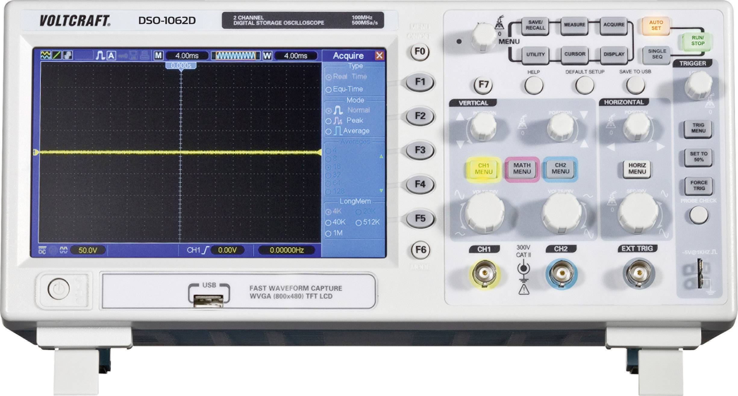 Das Einsteiger-Modell im Bereich der digitalen Speicheroszilloskope. Das Gerät verfügt über zwei Kanäle mit einer Bandbreite von 60 MHz und einer Realtime-Samplingrate von max. 1 GSa/s. Die Speichertiefe beträgt 512 kpts, wobei bei der Nutzung von nur einem Kanal bis zu 1 Mpts zur Verfügung stehen. Das 17,7 cm (7") große Farb-Display hat eine Auflösung von 800 x 480 Pixel bietet eine sehr gute Ablesbarkeit. In Verbindung mit dem USB-Host zur Speicherung der Daten auf einen optionalen Stick ist Ihr Digital-Oszilloskop DSO-1062D-VGA nahezu unschlagbar im Preis-/Leisungs-Verhältnis. Automatische Messfunktionen inkl. FFT, umfangreiche Trigger-Möglichkeiten, eine USB-Schnittstelle, ein mehrsprachiges Hilfemenü sowie eine serienmäßig im Lieferumfang enthaltene Software runden die Leistungsmerkmale Ihres Oszilloskops perfekt ab.