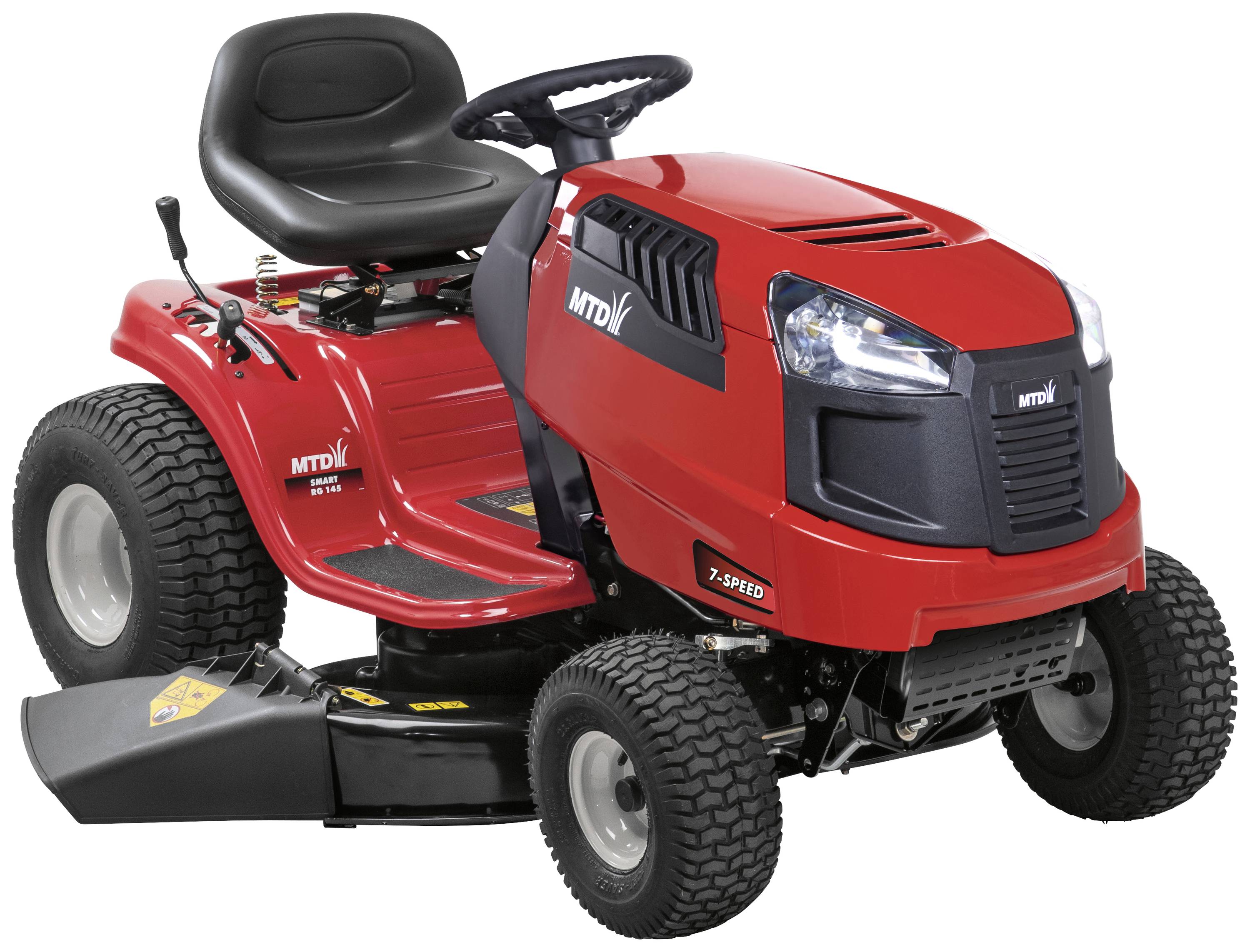 Bei einer komfortablen Schnittbreite von großzügigen 107 cm ist der RG 145 prädestiniert für den Einsatz auf sehr großen Flächen von bis zu 5.500 m². Dank des geringen Wendekreises von nur 46 cm büßt das Modell allerdings dabei keineswegs an Wendigkeit ein, sodass auch Bäume und Büsche kein Hindernis darstellen. Der Motor ist besonders leistungsstark (MTD 1-Zylinder, 9,0 kW, 547 cm³, Transmatic-Getriebe), die 7-Gangschaltung gestattet dabei stets die optimale Anpassung. Schnitthöhe und Mähwerk lassen sich 5-fach mit zwei Hebeln zwischen 30 und 95 mm ganz bequem vom Sitz aus einstellen. Mit der neuen OCR-Funktion (Operate Cutting Reverse) mähen Sie sogar beim Rückwärtsfahren und sparen sich Zeit. Daneben ist der RG 145 auch mit einer Deckwaschdüse zur einfachen Reinigung des Mähdecks ausgestattet. Während das Mulchkit und der Seitendeflektor im Lieferumfang enthalten sind, lässt sich der Funktionsumfang durch einen als Zubehör erhältlichen Fangkorb nochmals erweitern. Daneben bietet das Sortiment unzählige weitere Zubehörteile, die den Rasentraktor zu einem perfekten Allrounder für viele Arbeiten rund um Haus und Garten machen.