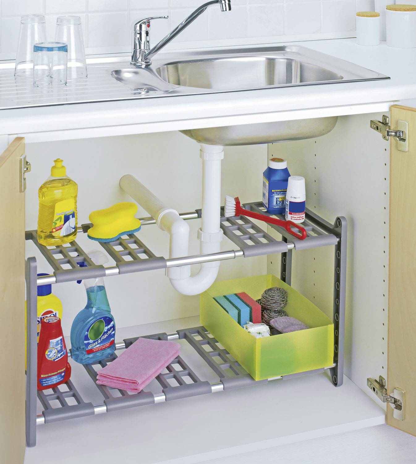 Das Unterschrankregal Flexi schafft viel Platz und zusätzliche Ablagefläche in der Küche. Ideal eignet sich das praktische Regal als Spülbeckenunterschrank zur Ablage von Putz- und Spülmitteln, Tüchern, Lappen, Bürsten und Schwämme.