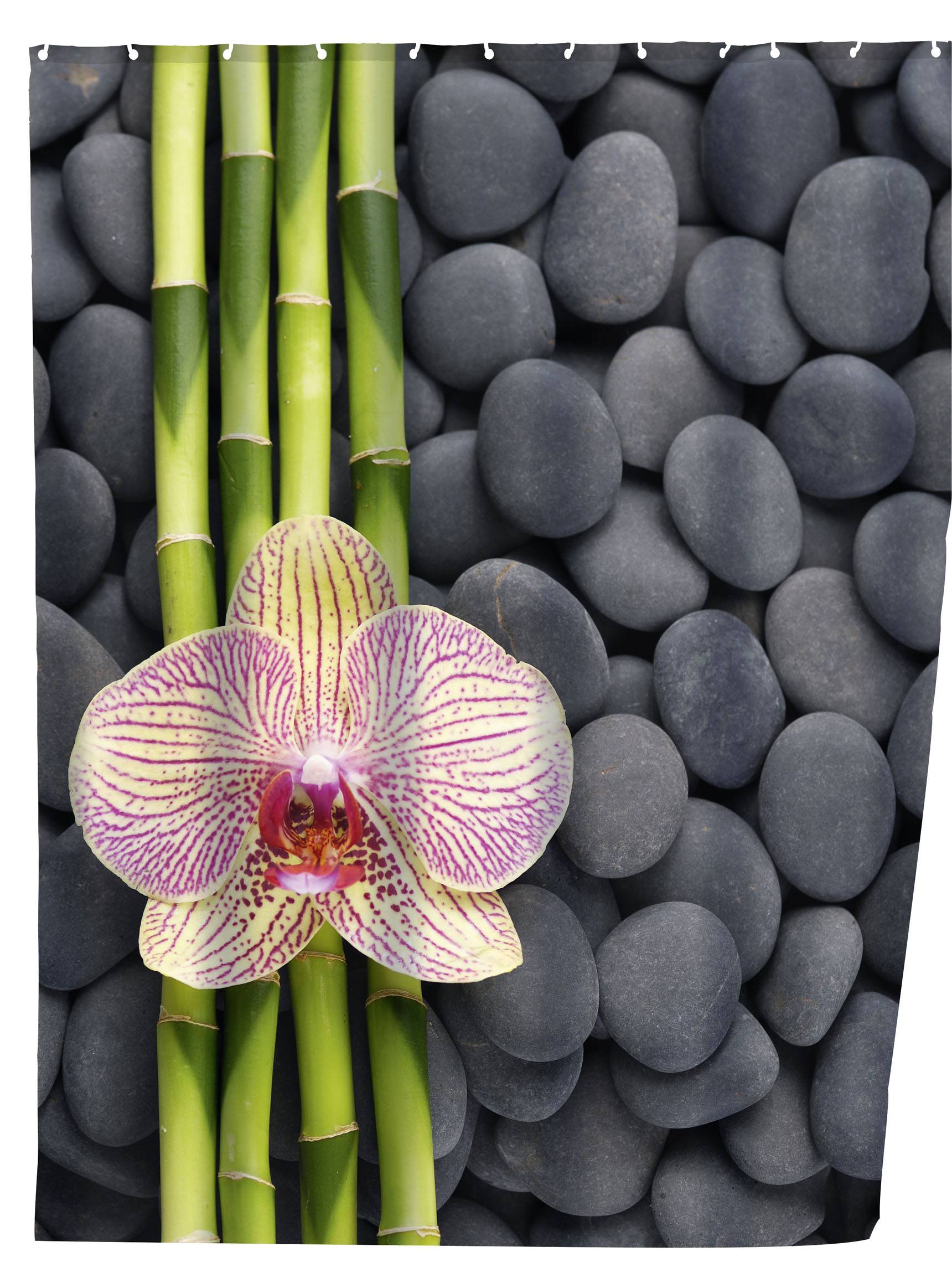 Der mit schönen Steinen und einer Blüte auf Bambus bedruckte Vorhang eignet sich mit einer Breite von 180 cm sowohl für Duschen als auch Badewannen.