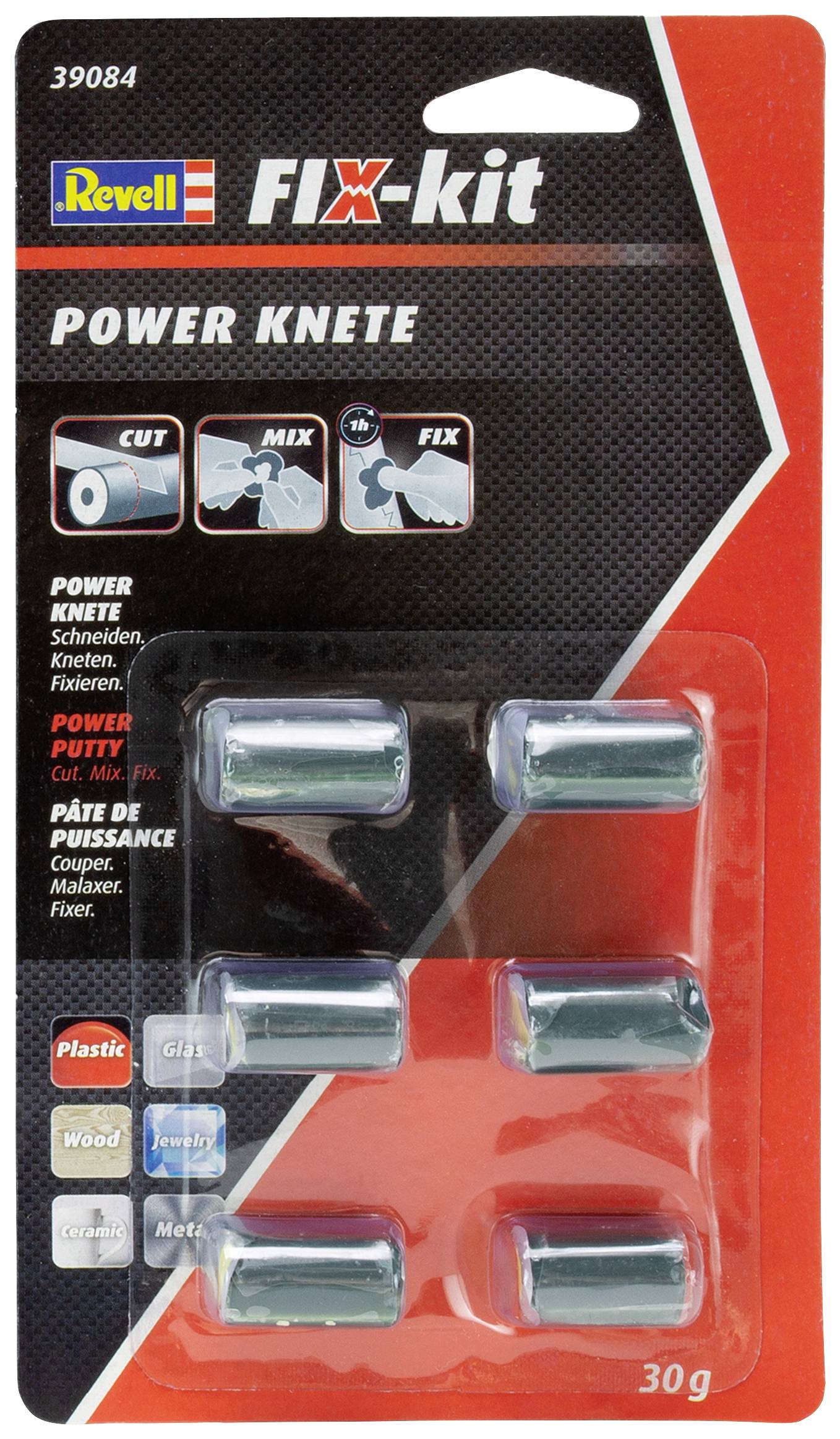 Die FIX-kit Power Knete von Revell ist ein 2-Komponenten-Kleber in fertig portionierten Einheiten. Die Komponenten werden durch einfaches Kneten vermischt und die Masse kann anschließend in Hohlräume oder Unebenheiten gedrückt oder zum Abdichten verwendet werden. Lästiges Anmischen entfällt und die Handhabung ist denkbar einfach. Die Knete härtet innerhalb 1 Stunde komplett aus und eignet sich für Stahl, Metall, Kunststoff, Beton, Keramik sowie Holz. Ideal für den Modellbau sowie alle anderen Einsatzzwecke im Bereich Hobby und Handwerk.