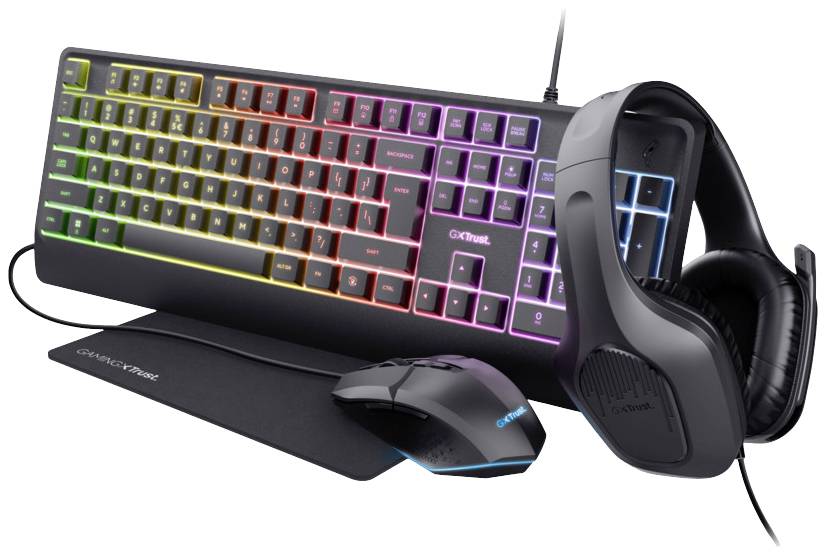 Trust GXT 792 Quadrox 4-in-1 USB Gaming-Tastatur, Maus-Set Beleuchtet, Inkl. Gaming Headset und Mauspad Deutsch, QWERTZ Schwarz