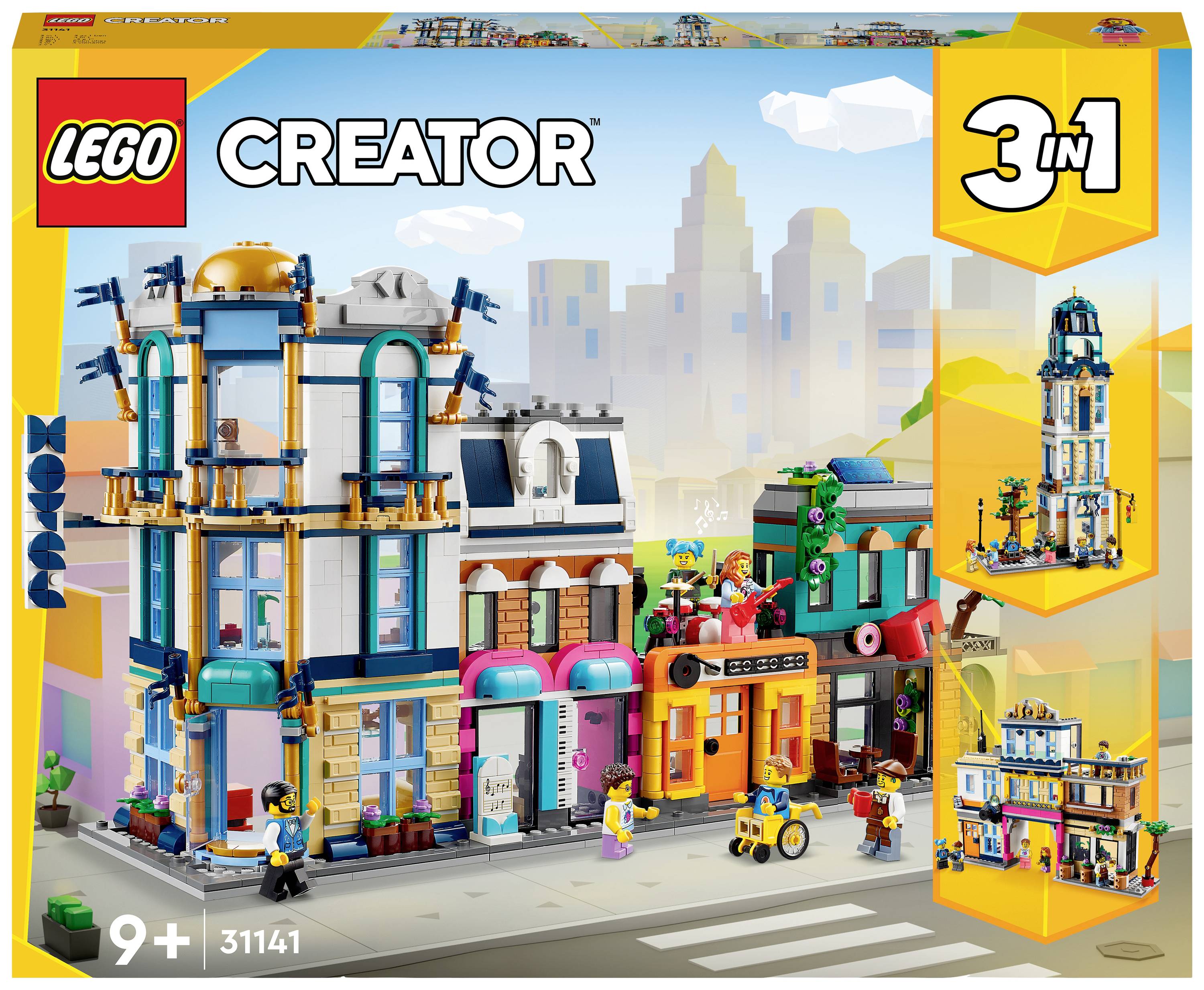LEGO Fans ab 9 Jahren können sich mit der LEGO Creator 3-in-1 Hauptstraße (31141) Set auf einen coolen Ausflug in die Stadt freuen. Sie können im Hotel einchecken, den Musikladen nach Schallplatten durchstöbern, im Café einen Snack holen und der Band auf der Dachterrasse zuhören. Falls das nicht reicht, können sie das Set in zwei weitere Modelle umbauen.