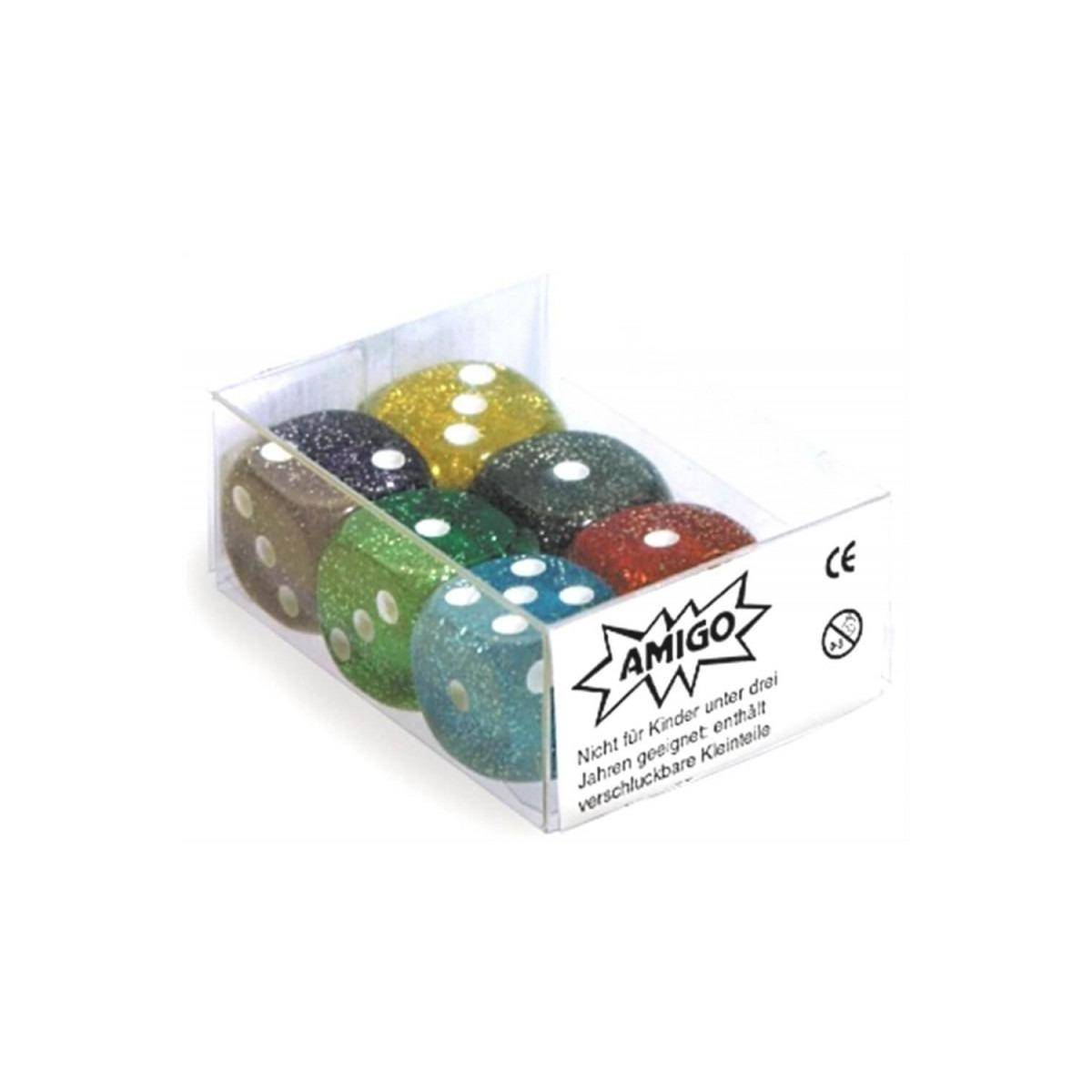 1 Set beinhaltet 6 Stück Augenwürfel, Glitter (farblich gemischt), 16 mm, 6 Seiten, Farbsortierung kann differieren.