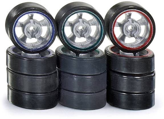 Ersatzreifenset für das SIKUracing Modell 6821,6823,6824,6825. Das Set enthält jeweils einen Satz (= 4 Räder) mit roter, blauer und grüner Reifenhärte-Markierung. Empfohlenes Lebensalter ab 6 Jahren.