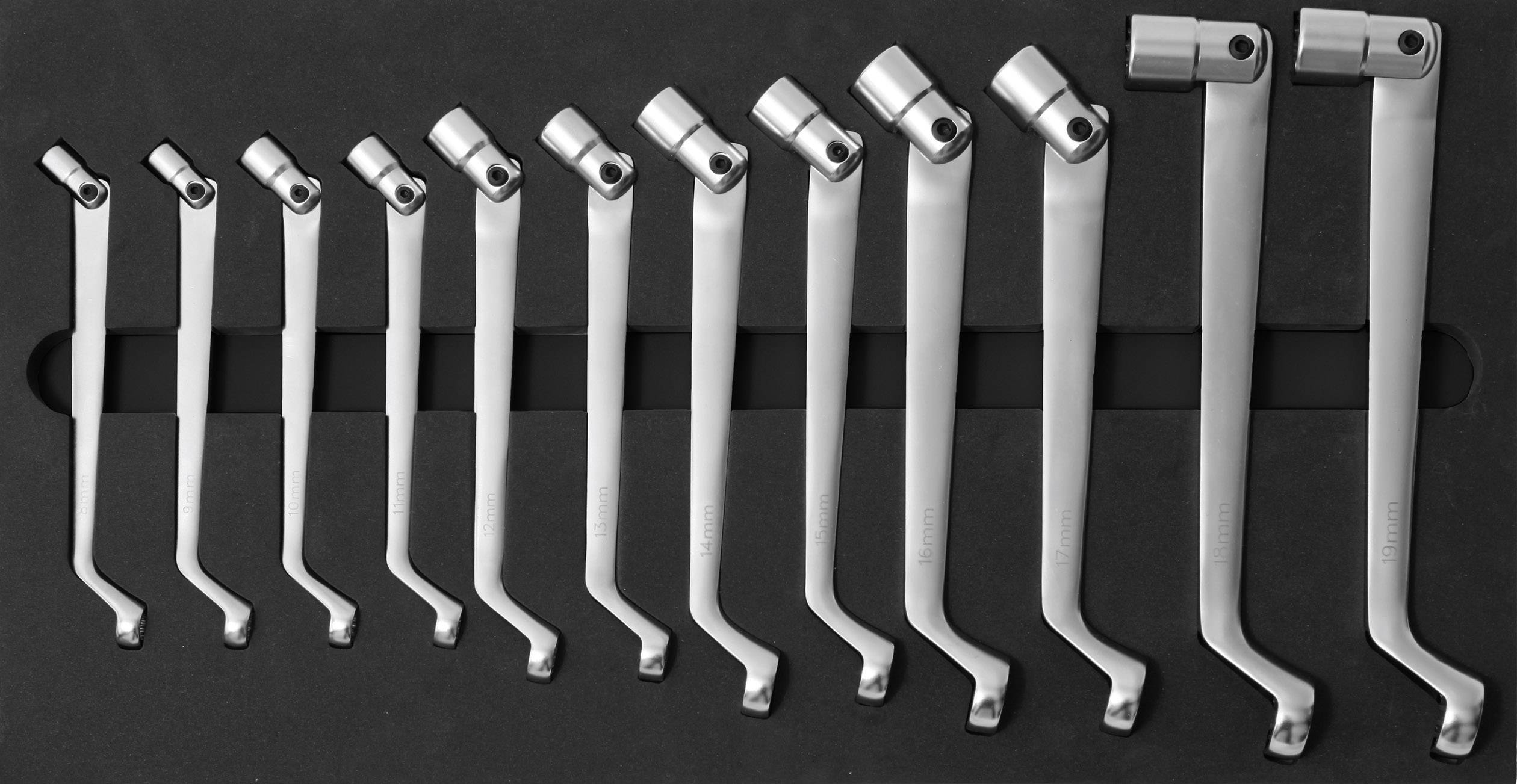 180° schwenkbarer Kopf ermöglicht das Arbeiten an vielen schwer zugänglichen Stellen. 90° gedrehter Schaft für optimalen Kraftansatz. In Schaumzuschnitt (LxBxH): 512x277x20 mm.