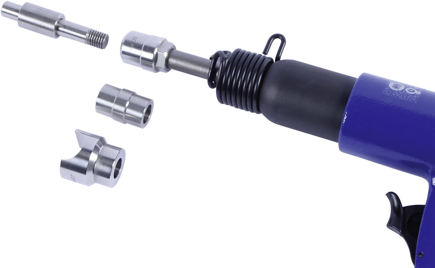 Das Ausdrücker-System 7KSA05 wird nach Entfernen der Mutter komplett aufgeschraubt. Anschließend wird ein DL-Meißelhammer aufgesetzt, um die verrostete Lenkerschraube herauszuhämmern.