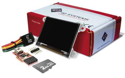 Dieses Kit enthält: Ein uOLED-160-G2 Anzeige-Modul, eine 2 GB microSD-Speicherkarte, einen uUSB-PA5-Programmieradapter, ein 150 mm 5-Wege-F-F-Jumperkabel für schnelle Verbindung mit einem anderen Gerät oder einer Lochrasterplatte, einen 5-Wege-M-M-Adapter für die Konvertierung des Jumperkabels und eine Schnellstart-Bedienungsanleitung.