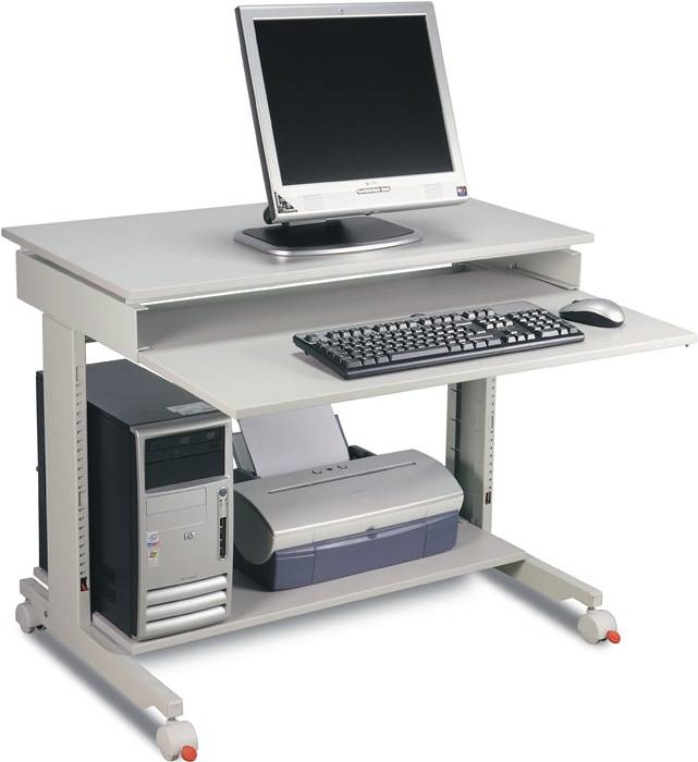 stabiles Stahlprofilgestell · Tischplatte aus melaminharzbeschichteter Spanplatte, lichtgrau, RAL 7035 · höhenverstellbar von 720-1100 mm · einfache Höhenverstellung: die Tischplatte wird angehoben und in einer der Raster eingestellt · einschiebbare Tastaturplatte · Fachboden · 4 Doppellaufrollen, 2 davon mit Feststeller, Rollen-Ø 40 mm Lieferung erfolgt zerlegt, einfache Montage Weitere technische Eigenschaften: · Ausführung: fahrbar