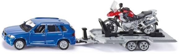 Zur entspannten Anreise zu Motorradtouren in weiter entfernten Gebieten bietet sich der BMW X5 mit Motorradanhänger geradezu an. Die auf dem Anhänger befestigte BMW R 1200 GS, in rassigem rot lackiert, wartet schon auf kurvige Straßen zum cruisen und touren. Zu öffnende Türen beim X5, ein Motorradanhänger mit vorbildgerechter Kippfunktion sowie eine detailliert herausgearbeitete GS mit klappbarem Ständer, eröffnen vielfältige Spielmöglichkeiten. Ab 3 Jahren.