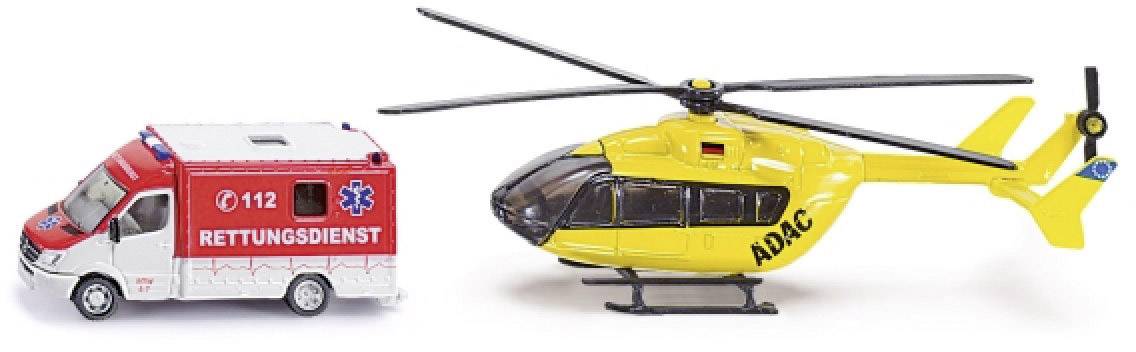 Set bestehend aus einem Mercedes-Sprinter Rettungswagen und einem Rettungshubschrauber der Marke Eurocopter EC 145. Beide Modelle sind fast komplett aus Metall gefertigt und glänzen durch hohe Detailgenauigkeit. Im kindgerechten Maßstab 1:87 gehalten sind die Modelle perfekt für Kinderzimmer-Rettungsaktionen. Die Rotoren des Hubschraubers sind drehbar.