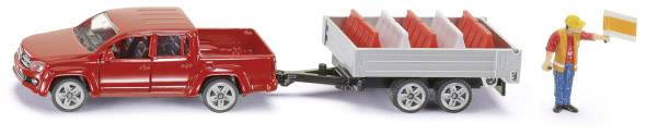 Der Lifestyle-Pickup Amarok von VW im Strassenbau-Einsatz mit Tandemachs-anhänger und Zubehör. Die Türen des mit einer Anhängerkupplung ausgestatteten Pick-Ups sind zum öffnen. Die Mulde des Tandemachs-Anhänger ist kippbar, die Klappe am Heck beweglich ausgeführt. Der Anhänger ist mit 5 Verkehrsleitblöcken in rot und weiß beladen. Zur Absicherung der Baustelle dient die Figur eines Bauarbeiters mit Helm und Fahne. Ab 3 Jahren.