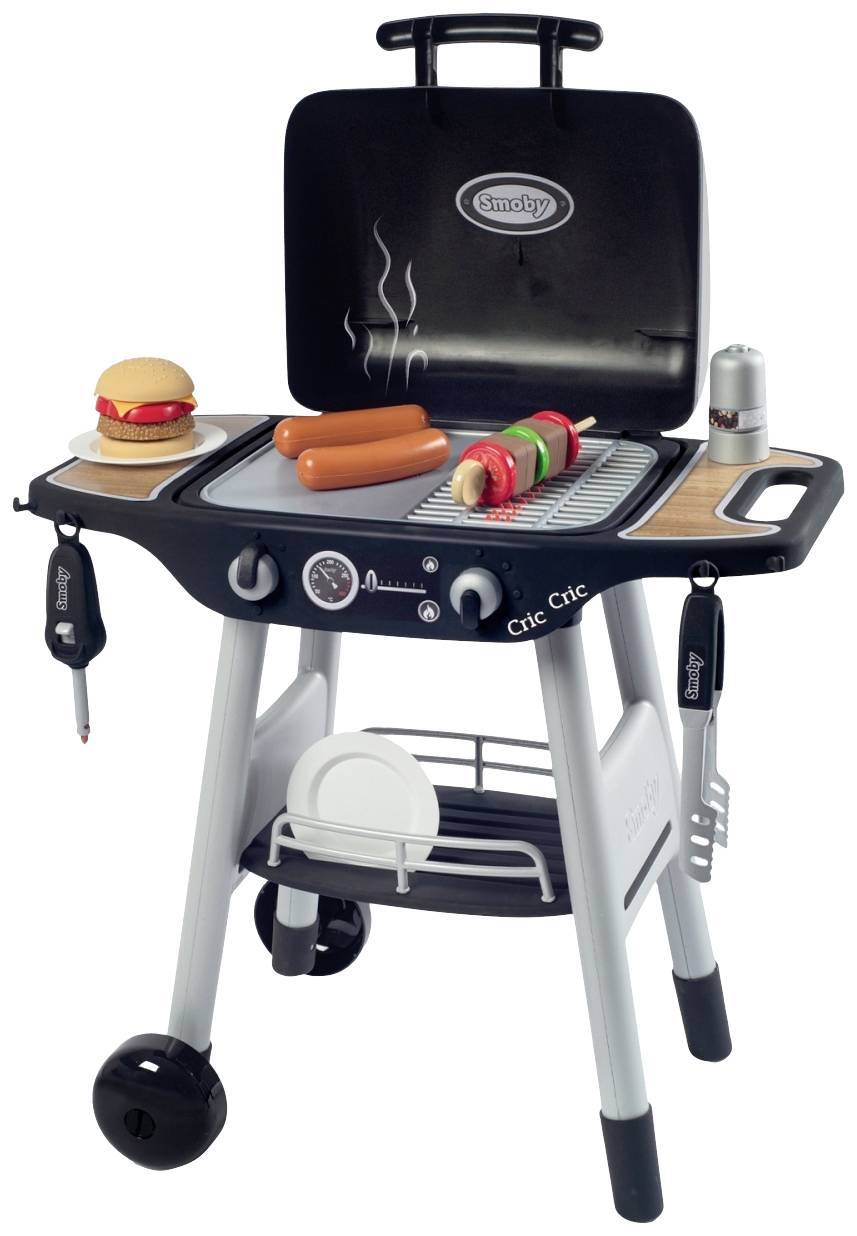 Die Grillsaison ist eröffnet! Mit dem neuen Barbecue Kindergrill von Smoby lassen kleine Grillmeister Papas blass aussehen. Ohne sich die Finger zu verbrennen, können sie spielerisch Burger, Würstchen oder Spieße grillen. Bei diesem Modell ist für jeden Geschmack das Richtige dabei! Der Burger kann selbst belegt und die Spieße zusammengesteckt, gesalzen und gepfeffert werden. Die Oberfläche ist unterteilt in Grillrost und platte mit viel Platz für die unterschiedlichsten Gerichte. Per Drehschalter springen sogar Plastikflammen durch den Grillrost nach oben. Zusammen mit dem Anzünder mit mechanischem Geräusch kommt echte Barbecue-Stimmung auf. Dank der Räder und des Griffs ist der stabile Grill leicht zu ziehen und überall einsetzbar. Unter der aufklappbaren Haube können die kleinen Nachwuchs-Köche wie beim Original immer wieder nachprüfen, ob das Essen fertig gegart ist. Auf der Ablagefläche ist genügend Stauraum für das Grillzubehör.