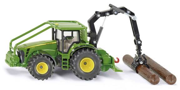 Schwere Aufgaben im Forst bedürfen kraftvoller Maschinen: Mit dem neuen John Deere Forsttraktor steht im Maßstab 1:50 ein verlässlicher und zugleich bärenstarker Schlepper bereit, der einsatzgerecht über eine funktionsfähige Forstausrüstung verfügt. Eindrucksvoll ist der Überrollbügel, der Motorhaube und Kabine gleichermaßen vor Unfällen in unwegsamem Terrain schützt. Der Heckkran bewährt sich bei allen Rückearbeiten im Kinderforst, weil er komplett beweglich ist und der Bergefantasie keine Grenzen setzt. Der zugehörige Greifer lässt sich um 360° drehen und ist natürlich beweglich. Während die Frontwinde nachgebildet ist, überrascht der John Deere-Forsttraktor mit einer Heckwinde mit einzigartigem Rückzugsmotor. So kann die automatische Bergung des beiliegenden Baumstamms vorgenommen werden. Damit wird die Holzbergung im preiswerten Farmer Einsteigermaßstab 1:50 möglich. Selbstverständlich ist der Forstschlepper zu allen anderen maßstabsgleichen Modellen von SIKU Farmer und SIKU Super möglich. Ab 3 Jahren.