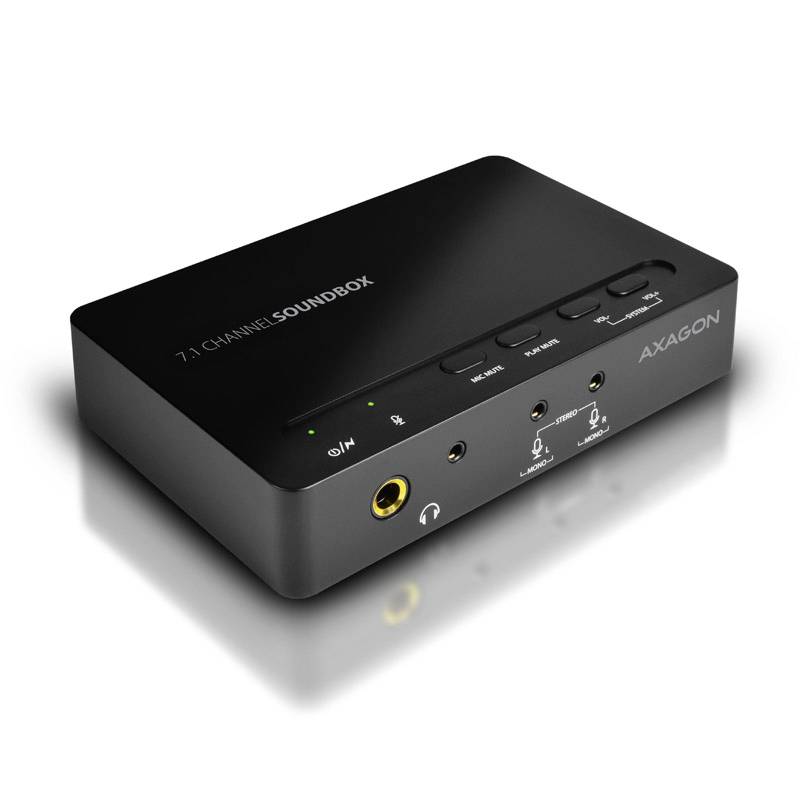 Die AXAGON ADA-71 SOUNDbox externe 7.1 USB-Soundkarte erweitert den Computer um Surround Sound und eine Menge an Audio Aus- und Eingängen.