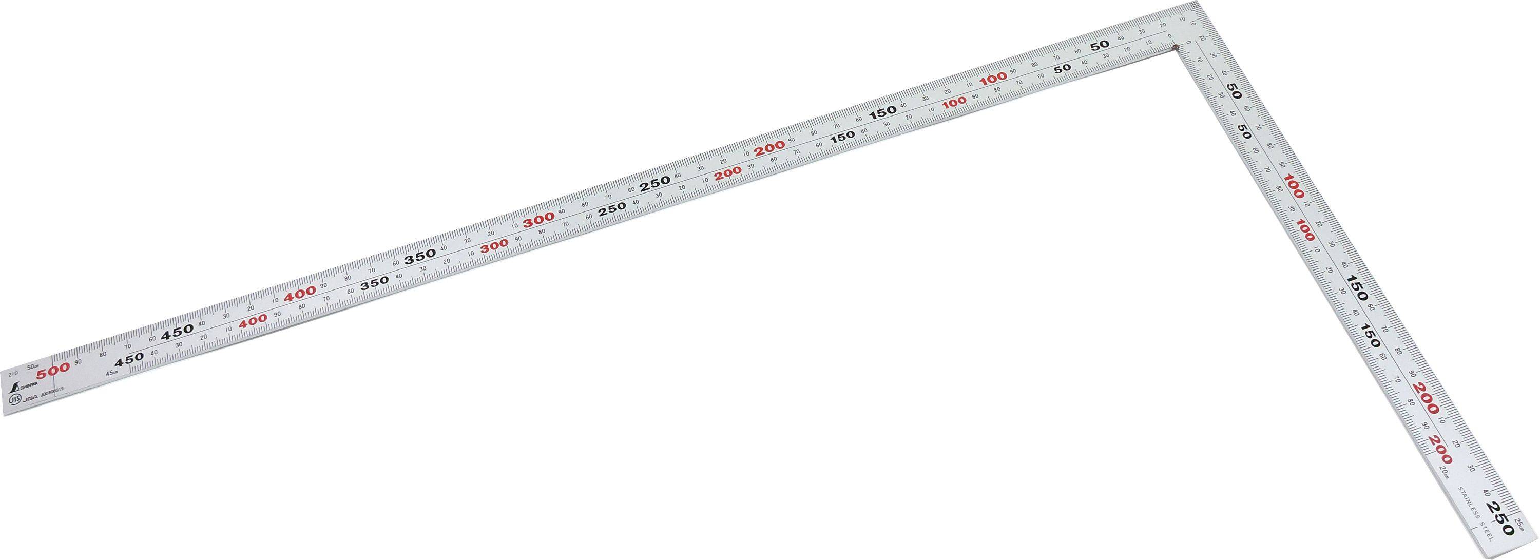 Die äußere Länge dieses Zimmermannswinkels beträgt 50 cm, während die innere Länge entlang des Hauptendes 25 cm beträgt.