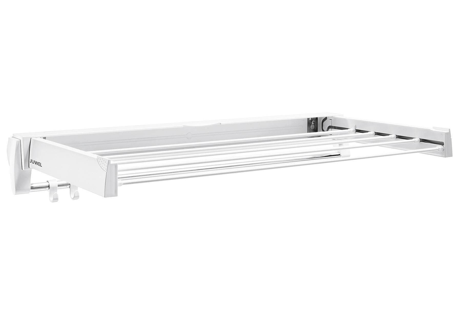 Wandtrockner ArtDry 70 – weiß. Die Kunst des Trocknens! Design im schönen Bad, geniale Technik! Ca. 4,0 m Trockenlänge, versenkbare kunststoffummantelte Stahlstäbe, Handtuchstange mit Haken. Länge: ca. 75,5 cm, Bohrabstand: ca. 63 cm.
