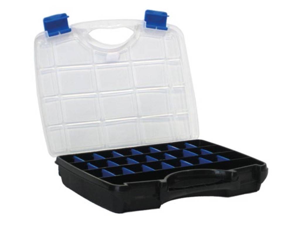 Tayg Sortimentskasten, max. 25 Fächer, 21 Trennwände, transparenter Deckel, stapelbar, 388 x 290 x 61 mm, Schwarz/Blau