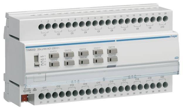 Schalt-/Jalousieaktor 20/10-fach KNX,16A CLast. Reiheneinbaugerät mit integriertem Busankoppler. Dient zum Schalten von unabhängigen Lasten oder zur Ansteuerung von Antrieben und ist ausgestattet mit potentialfreien Schließern und kann mehrphasig angeschlossen werden. Schalten oder Rollladen-/Jalousieantrieb im Auf- oder Abbetrieb. Zur Steuerung von Beleuchtungsausgängen kann zwischen EIN/AUS, Zeitschaltung, Sicherheits-Aus, Zwangssteuerung, Sperr-, Logik-, Preset-, Verzögerungsfunktion oder 64 Szenen ausgewählt werden. Mit Umschaltfunktion für Zeit oder Dauerfunktion. Über die Jalousiefunktion kann der Fahrbefehl AUF/AB/Stopp und der Lamellenwinkel verstellt werden. Prozentansteuerung der Jalousie zum Fahren einer vordefinierten Position. Mit der Sonnenschutzfunktion kann in Verbindung mit einem Außensensor die Helligkeit pro Raum gesteuert werden. Mit Alarmfunktion zur Steuerung der Jalousie in eine definierte Position. Sicherheitsabfahrt solange die Taste gedrückt bleibt. 64 Szenenfunktionen pro Kanal. Logikblock zur Steuerung des Ausgangs in Abhängigkeit zum Ergebnis einer logischen Verknüpfung. Preset-, Sperrfunktion, Zwangssteuerung. Das Gerät setzt die Businformationen in entsprechende Befehle um. Die Ausgänge werden über die Systemleitung von den ihnen zugeordneten Eingängen geschaltet. Betriebsstundenzähler pro Ausgang. Das Gerät kann mit einem Diagnostikwerkzeug ausgelesen werden. Mit Programmiertaste und roter Programmier-LED, Busanschluss über Busklemme, Schaltkanäle über Kastenklemmen. Keine externe Spannungsversorgung notwendig. Mit Handbedienung und LED Schaltzustandsanzeige sowie Beschriftungsmöglichkeit direkt am Gerät. Hinweis: Das Gerät lässt sich mit der ETS (ab Version 4) programmieren.