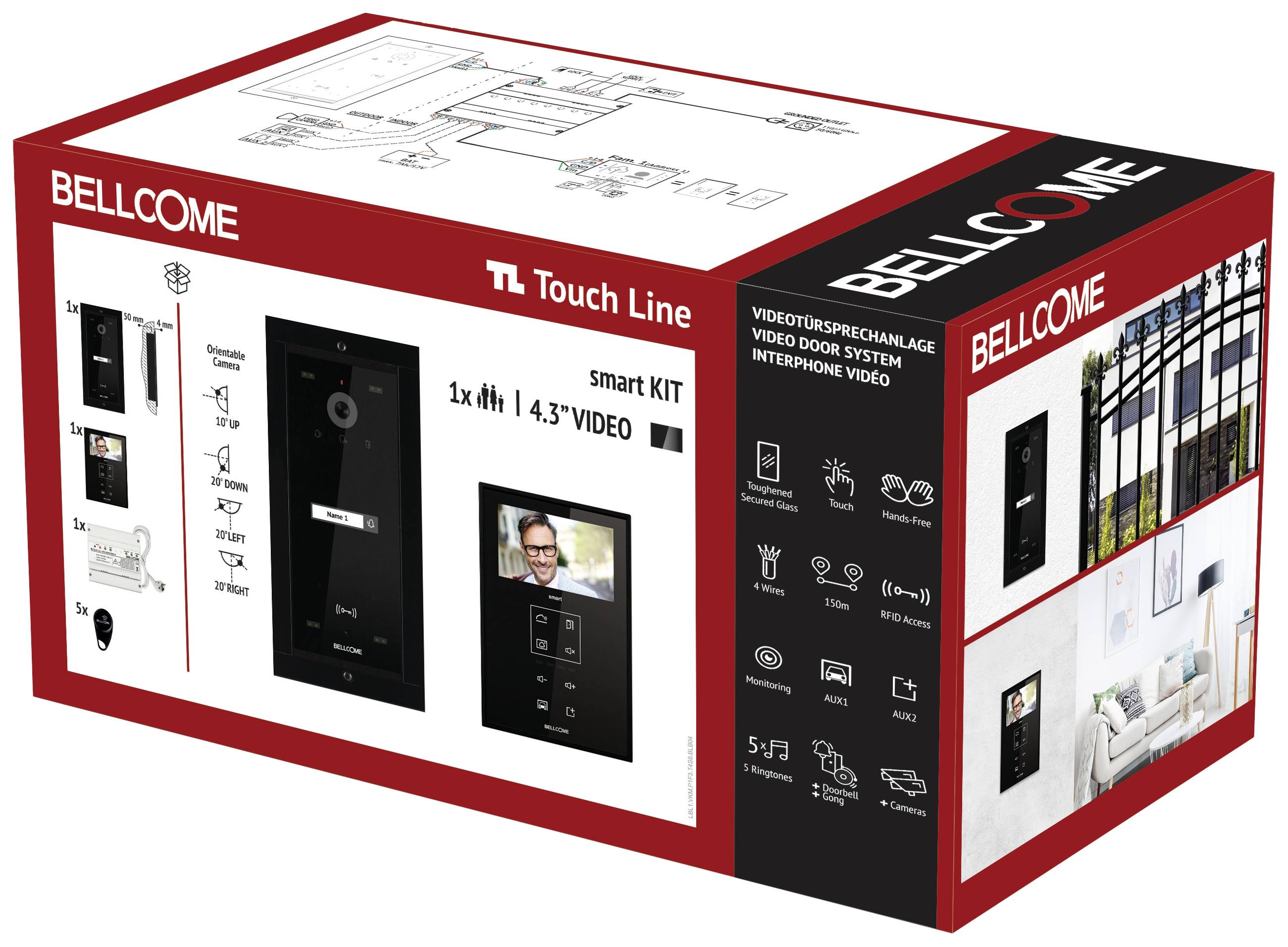 BELLCOME smart - Video-Türsprechanlage Komplettes KIT für 1 Familie, SCHWARZ, 4-Draht-Installation, gehärtetes Glas und Touch-Tasten im Innen- und Außenbereich, integrierte ausrichtbare Videokamera und Weiß Beleuchtung, hinterleuchteter Name, 10,922 cm (4,3") TFT-LCD-Display, Vollduplex (ohne Handgerät), Unterputz Außeneinheit.