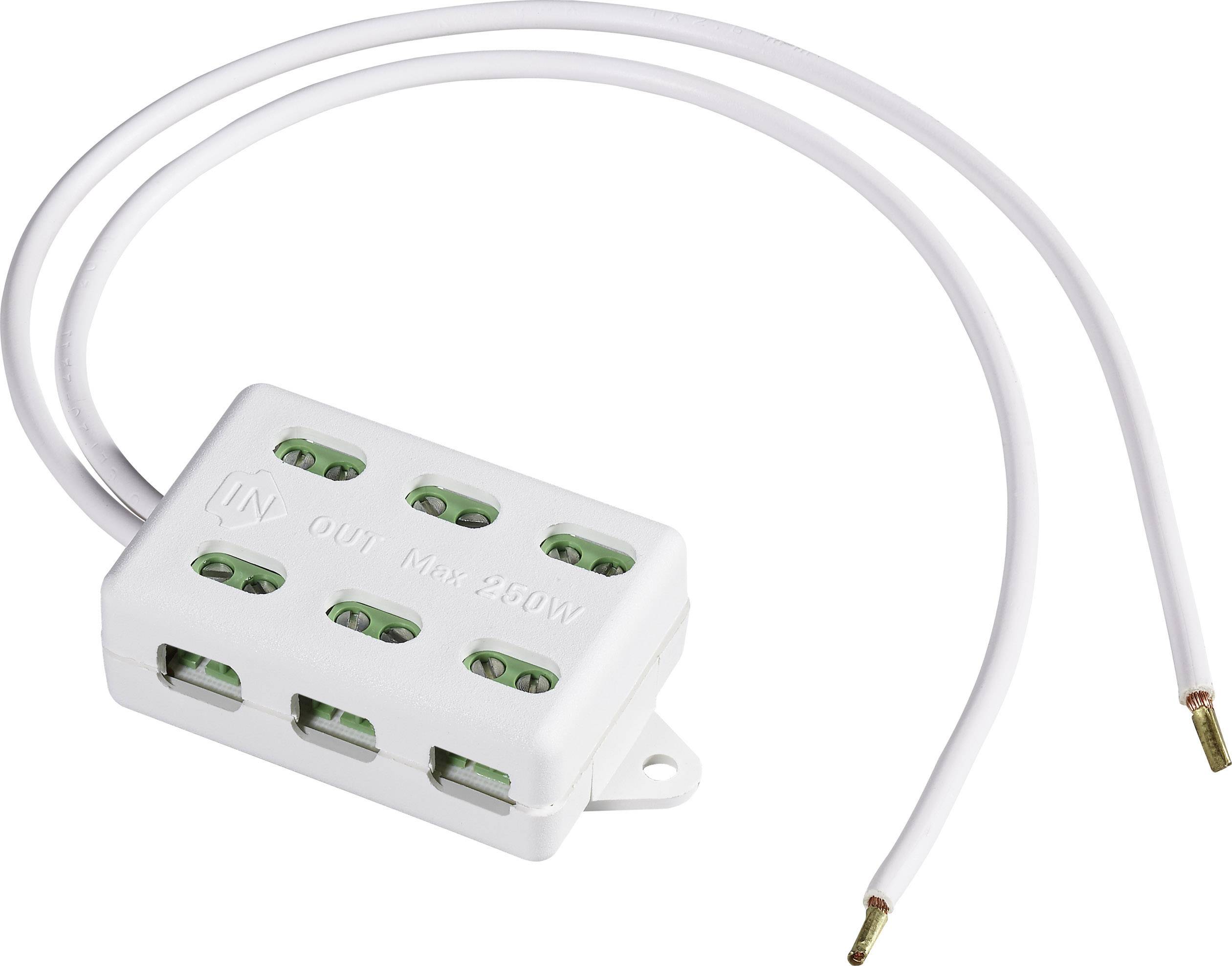 Schraubbarer 6-fach Verteiler für max. 250 W Anschlußleistung mit max. 50 W je Ausgang bei 2,5 mm²-Leitungsquerschnitt · Zuleitung: 25 cm.
