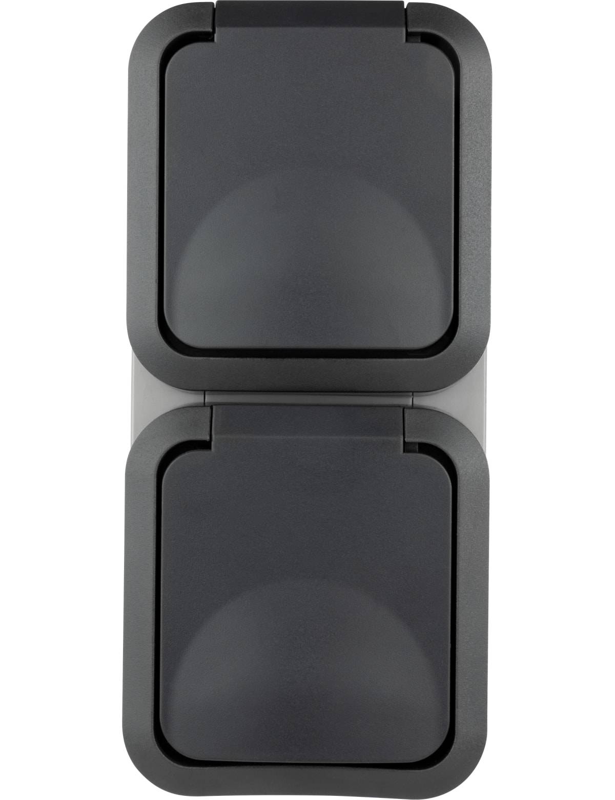 Aufputz-Feuchtraum 2-fach Schutzkontakt-Steckdose im Design STANDARD und der Farbe dunkelgrau mit Klappdeckel in Senkrechter Ausführung. Technische Daten: - Nennspannung: 250 V~ - Nennstrom : 16 A, max. 3680 W - Montageart: Senkrecht - Schutzart: IP44 - Material: Kunststoff - Betriebstemperatur: -5...+35 °C - Gewicht: 276 g - Maße (BxHxT): 162x75x57 mm - Farbe: dunkelgrau