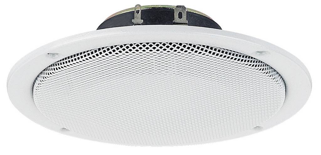 Einbaulautsprecher, 20 WMAX · Hochtonkegel für breitbandige Wiedergabe · Besonders flache Bauform · Festmontiertes Metallgitter · Geeignet für Durchsagen und Hintergrundmusik im Innenbereich