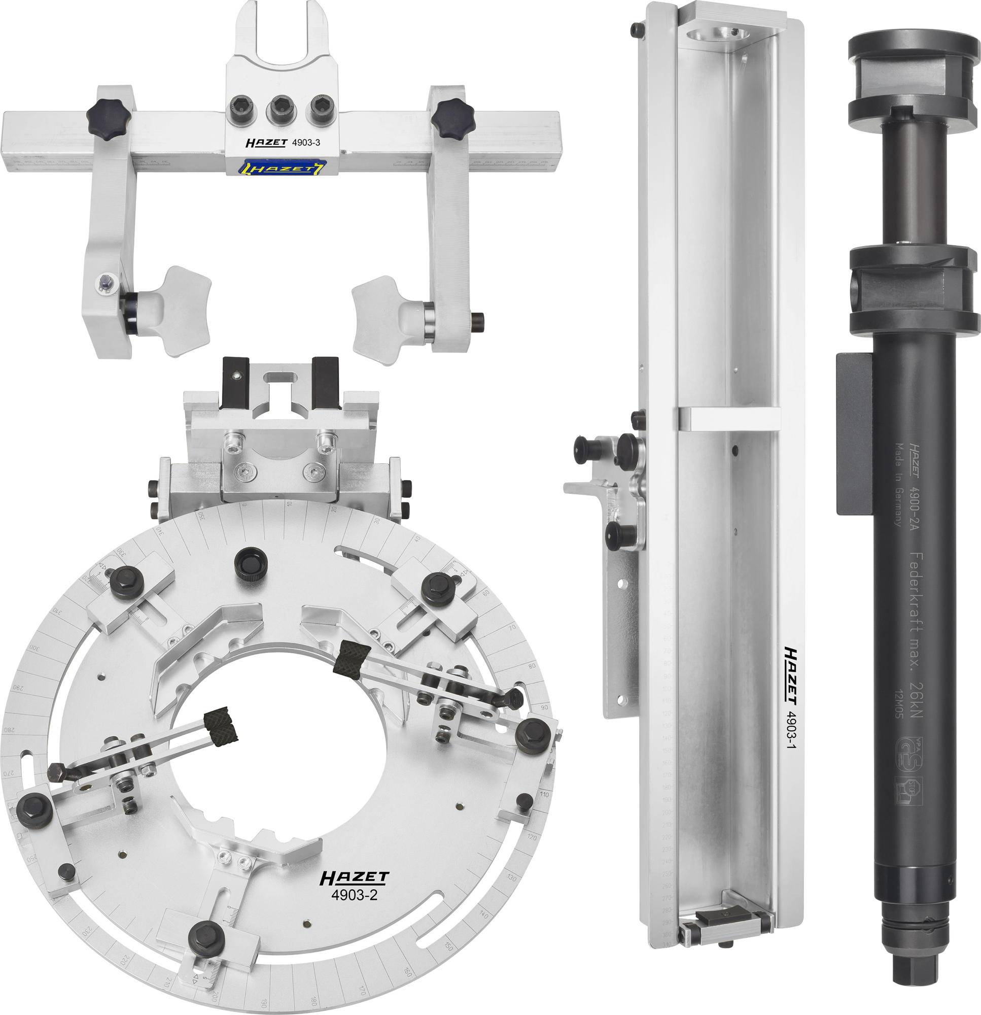 Mehr Sicherheit - dank lastfreier Montage!. · Universell einsetzbar für fast alle Feder-/ Stoßdämpferbeine. · Lastfreie Demontage/ Montage bei komplett entlastetem Dämpfer. Neuartiges Aufnahme- und Montagekonzept. · Schwenkbar in waagerechte oder senkrechte Arbeitsposition. HAZET-Empfehlung ergonomische Arbeitshöhe: Senkrecht einstellen, waagerecht betätigen. · Beschädigung an Dämpfern und Kopfplatten ausgeschlossen. (keine Überlastungsmöglichkeit). · Einfache, arretier- und fixierbare Federbeinaufnahme. Hohe Sicherheit. · Durchgängig sichere Aufnahme der Kopfplatten. · Gewindebeschädigung der Kolbenstange ausgeschlossen. · Permanente Fixierung der Feder während gesamten Arbeitsvorgangs. Investitions-Sicherheit - Nutzung vorhandener Komponenten SYSTEM 4900. · Vorhandene Grundgeräte 4900-2 A und alle Spannplatten des Systems 4900 einsetzbar. · Einsatz zukünftiger Anwendungen gesichert. Dokumentationsfähigkeit durch Skalierung. · Deutliche Zeitersparnis im Wiederholungsfall. · Feste Fixierung erübrigt Neueinstellung bei gleichem Federbein (links/ rechts). 4 Schritte zum Erfolg:. · Federbein auf Spannteller über Greifer und Bremsen fixieren. · Feder mit Universal-Spannplatte greifen. · Spanner mit Umschaltknarre oder Akku-Schrauber zusammenfahren. · Dämpfer lastfrei demontieren und neuen montieren. (danach umgekehrte Reihenfolge). Made In Germany. · Das perfekte Komplettpaket. · 4teilig, Inhalt:. · 4900-2 A Sicherheits-Federspanner Grundgerät. · 4903-1 Grundträger. · 4903-2 Universal-Spannteller, verstellbar. · 4903-3 Universal-Spannplatte, verstellbar, inkl. Sicherheits-Adapter.