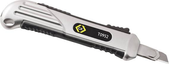 Gehäuse aus Zinkdruckgusslegierung mit rutschfestem Griff. Einziehbare Klinge mit Positionierung per Druckknopf für optimale Kontrolle und Sicherheit. Integrierter Klingenbrecher. Öse zum Aufhängen.