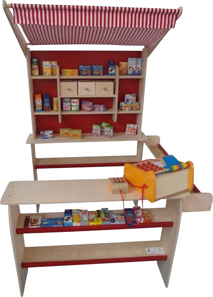 Großer stabiler Kinderkaufladen aus Birkenholz mit Stoffdach. Das Seitenteil ist sowohl links als auch rechts montierbar.