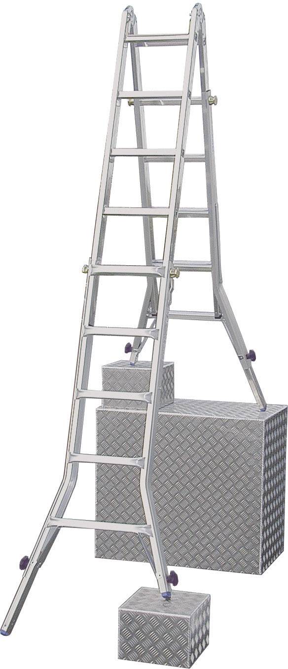 Vierteilige teleskopierbare Alu-Gelenkleiter: einsetzbar als Doppel-Steh-, Anlegeleiter oder als zwei separate Doppel- Stehleitern mit 4 integrierten Holmverlängerungen (stufenloser Höhenausgleich bis 230 mm) · Durch die teleskopartige Verschiebung der äußeren Leiternteile von Sprosse zu Sprosse (ClickMaticSystem) und die Möglichkeit des Auszugs der 4 integrierten Holmverlängerungen passt sich die Leiter den unterschiedlichsten Einsatzbereichen (Treppen, Absätzen, Bodenunebenheiten etc.) an · Das patentierte ClickMaticSystem (Einrastvorrichtung) lässt sich schnell und mühelos bedienen · Leiterninnen- und -außenteile ergeben mit wenigen Handgriffen zwei separate Doppel-Stehleitern, die mittels Alu-Diele als Arbeitstisch oder Arbeitsbock genutzt werden können. (nur in Verbindung mit Zubehör Combi Traverse)