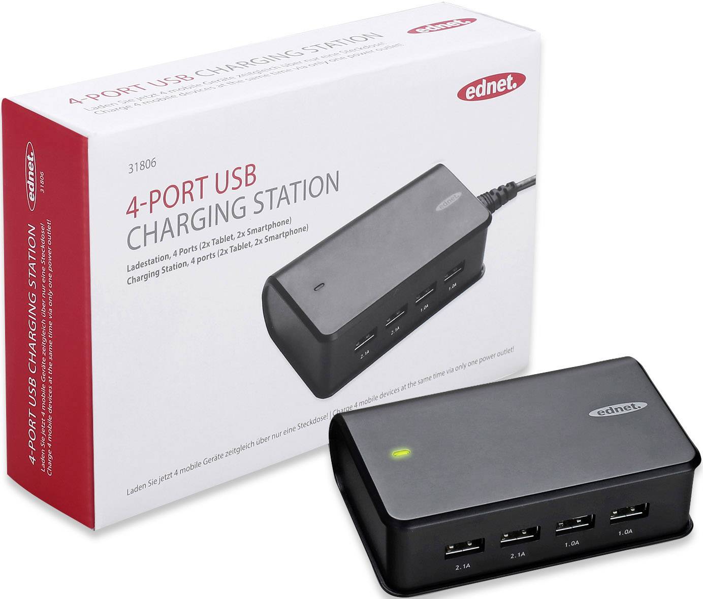Laden Sie jetzt bis zu vier Geräte wie z.B. Tablets, Smartphones, MP3-Player, Kameras, Power Banks, etc. gleichzeitig über nur eine Steckdose auf. Durch ihr kompaktes Design und das integrierte Netzteil, kann die ednet 4-Port USB-Ladestation überall platzsparend plaziert werden. Ihr praktischer Begleiter egal ob Zuhause, am Arbeitsplatz oder Unterwegs. Die Ladestation bietet Ihnen zwei USB-Ports mit 2,1A Ausgangsleistung, ideal zum Laden von Tablets und zwei weitere Ports mit 1A zum Laden von Smartphones, MP3-Playern, etc. Die ednet 4-Port USB-Ladestation ist die perfekte Lösung, mehrere Geräte schnell und zeitgleich aufzuladen.